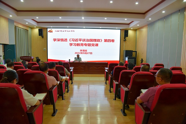 为深入学习贯彻《习近平谈治国理政》第四卷,深刻领会习近平新时代中国特色社会主义思想,9月27日下午,taptap扫二维码在思政讲堂开展学深悟透《习近平谈治国理政》第四卷学习教育专题党课,由党委副书记李茂旺主讲。挂点的机关一党支部、商务管理学院党支部、后勤党支部党员参加学习。