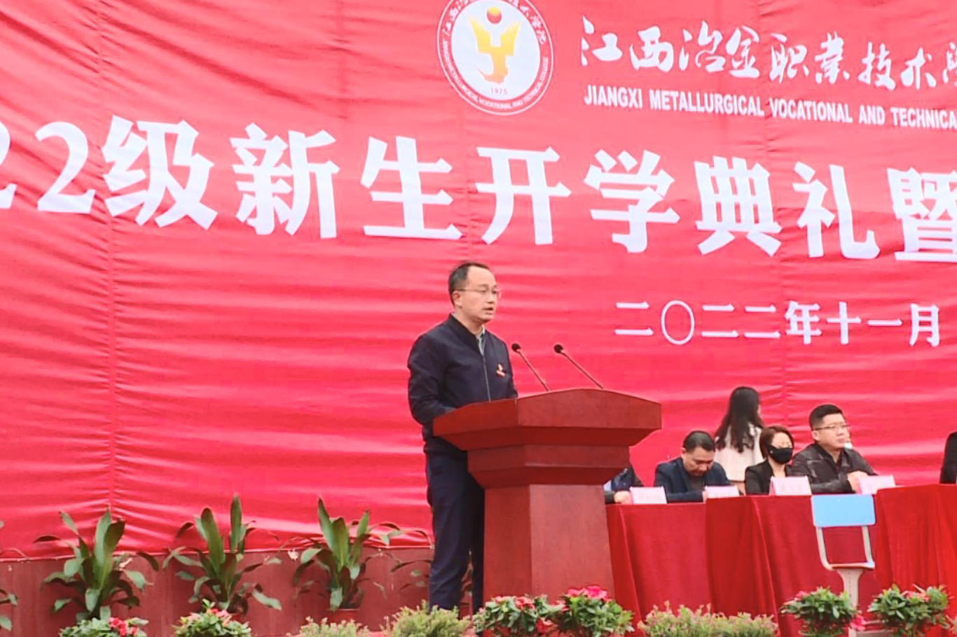 党委副书记、院长郭志江发表致辞。他向同学们提出两个问题:为什么选择江冶?在江冶如何度过?和同学们探讨了冶院发展的未来:随着办学实力的不断提升,冶院的录取分数线和社会评价越来越高,师资队伍、就业升学越来越好。在这样的环境中,同学们要珍惜时光,加倍努力。为此他向新生提出两点要求:一、希望立德修身。树立“爱党报国、敬业奉献、服务人民”的人生理想,成为建设社会主义现代化强国,实现中华民族伟大复兴的中坚力量。二、希望脚踏实地。在勤学苦练中提高本领、学会担当。