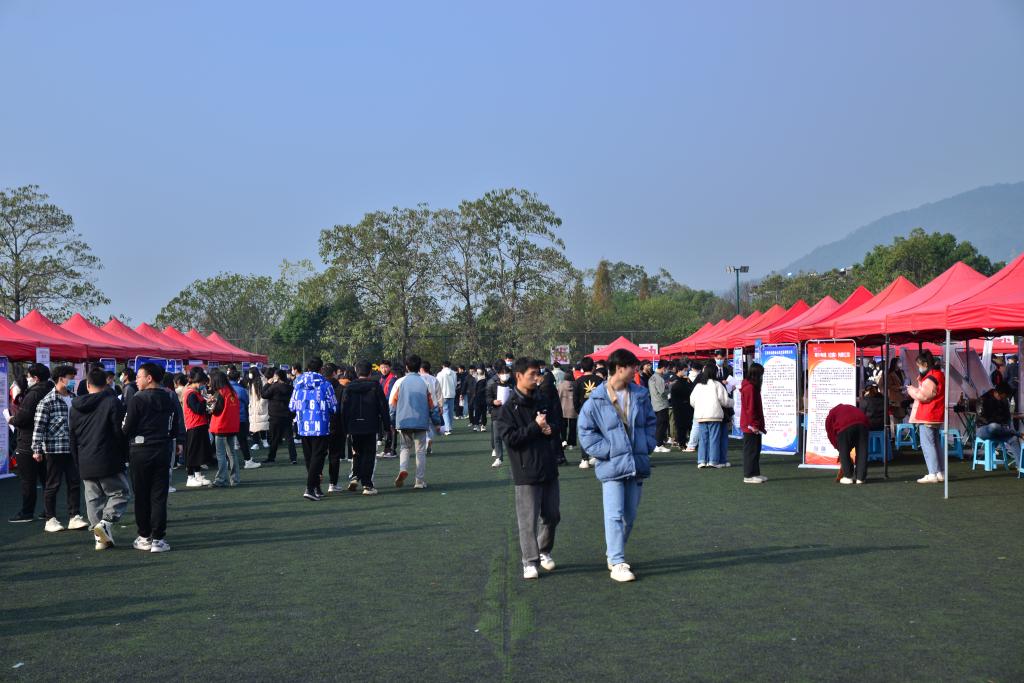 2022年12月10日,我校足球场上彩旗飘扬,人潮涌动,气氛十分热烈。学校年度毕业生招聘会在这里举办。158家企业来招聘会挂牌招聘,共提供就业岗位近8000个,超出学院应届生总数。