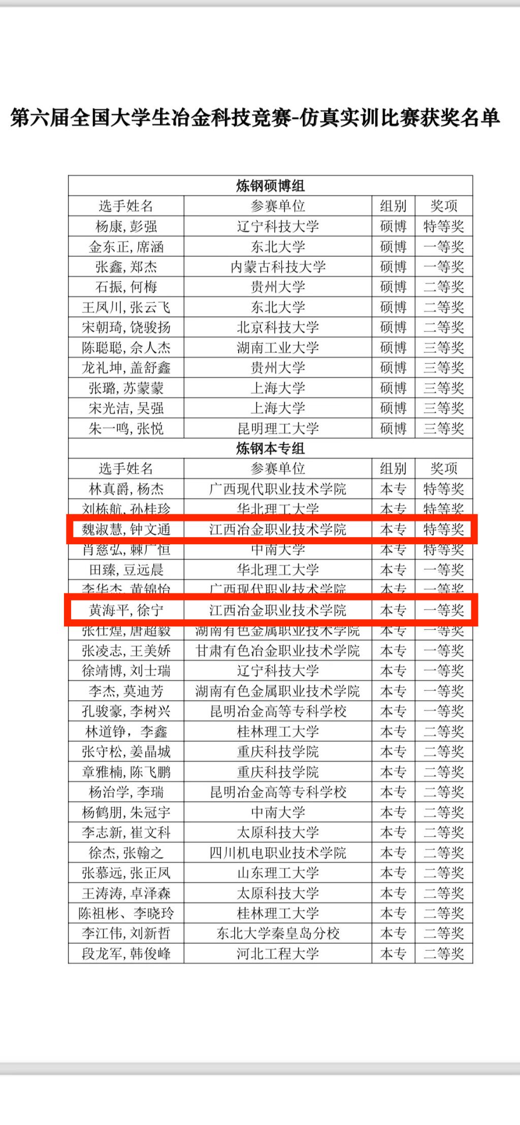 7月27日获悉,在第六届全国大学生冶金科技竞赛中,学校冶金工程学院的四支队伍参加转炉炼钢仿真和火法炼铜仿真两个赛项,获得特等奖2项、一等奖1项和三等奖1项。转炉炼钢单项中钟文通、魏淑慧同学荣获本专组特等奖,黄海平、徐宁同学荣获一等奖;火法炼铜单项中叶晶菁、吴启超同学荣获特等奖,古伟龙、章康宁同学荣获三等奖。