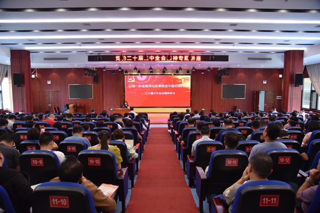 9月24日,我校在图书馆报告大厅举办学习贯彻党的二十届三中全会精神宣讲报告会,邀请市委党校副校长张萍教授作专题宣讲。学校党委副书记李茂旺主持,全校300余名党员教师参会聆听。