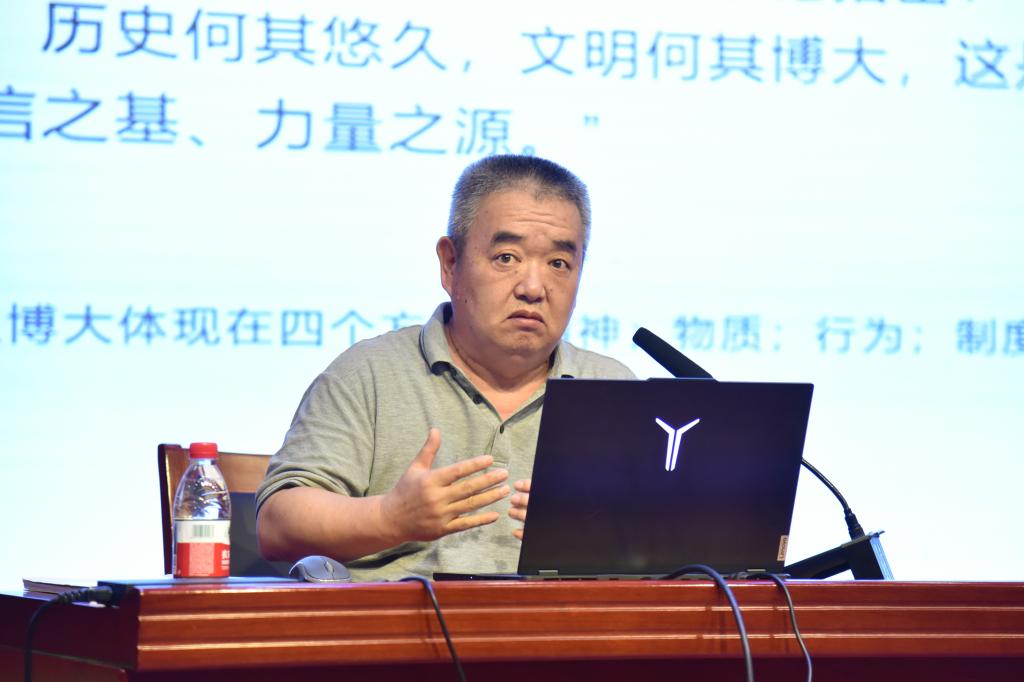 讲座以文明对话国际日新闻开场,介绍了中宣部《习近平文化思想学习纲要》读本,要求同学们加强学习,广泛了解中华优秀传统文化,坚定文化自信,实现精神上的独立自主。