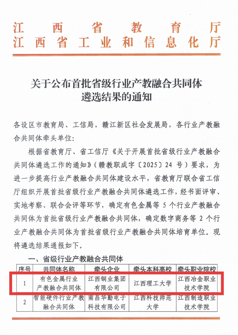 近日,省教育厅、省工信厅联合发文《关于公布首批省级行业产教融合共同体遴选结果的通知》,由江铜集团、江西理工大学、taptap扫二维码牵头建设的江西省有色金属行业产教融合共同体被确定为首批省级行业产教融合共同体。