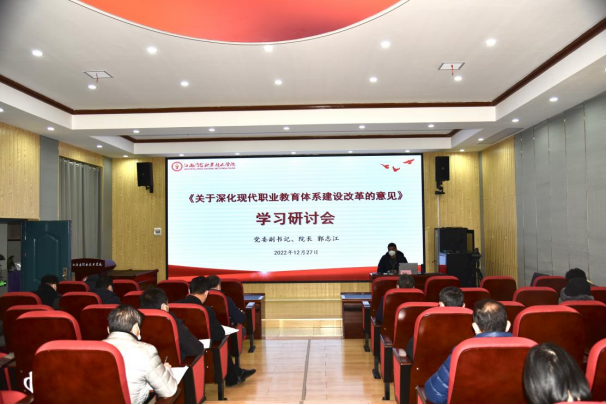 12月27日,学校在思政讲堂召开集中学习研讨会,学习中共中央办公厅、国务院办公厅印发的《关于深化现代职业教育体系建设改革的意见》(以下简称《意见》)。学校党委副书记、院长郭志江领学,全体中层干部参加学习。