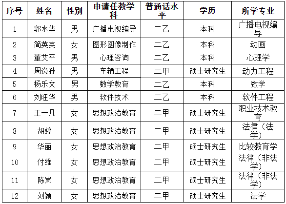根据省教育厅《关于做好2023年下半年全省普通高等专科学校和成人高等学校教师资格认定工作的通知》经个人申报,教务处、人事处等相关职能部门审核,学校确定郭水华等12位老师符合申报高校教师资格证认定条件,准予申报,具体名单公示如下:
