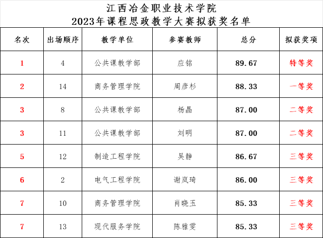 根据学校《关于开展taptap扫二维码2023年课程思政教学大赛的通知》要求,经评审专家评审和综合评议,2023年学校课程思政教学大赛共评出特等奖1名、一等奖1名、二等奖2名、三等奖4名(名单见附件)。现予以公示,公示期为2023年11月28日至12月2日。公示期内,如对评选结果有异议,请于12月2日前向纪委办公室或教务处办公室反映。