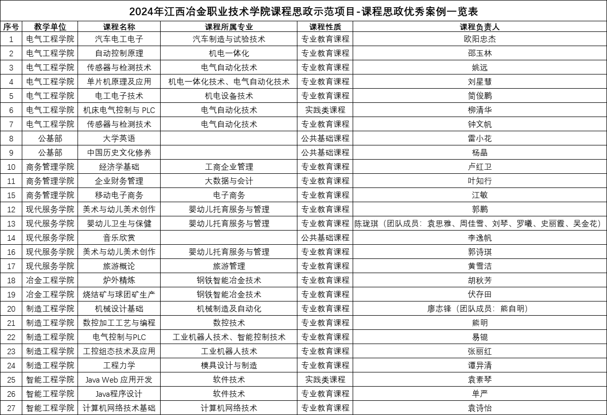根据学校下发的《关于开展2024年课程思政示范项目建设工作的通知》(赣冶院教字〔2024〕16号)文件要求,经过各教学单位组织教师自愿申报,分院初审,教务处组织校外专家进行评审和学校复议,拟确定《汽车电工电子》等27个案例为课程思政优秀案例,《自动控制原理》等15门课程为校级课程思政示范课程,邵玉林等15名教师为校级课程思政教学名师,《移动电子商务》江敏教学团队等15个团队为校级课程思政示范教学团队。现进行公示。