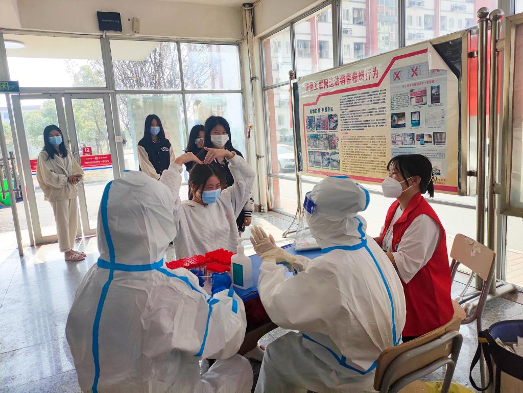 开展核酸检测——图片故事:各学院按照学校要求,落实“三级包保”“五级联包”网格化管理,设立栋长、层长负责制,利用学工魔方小程序,精准定位管理每个学生静态管理。