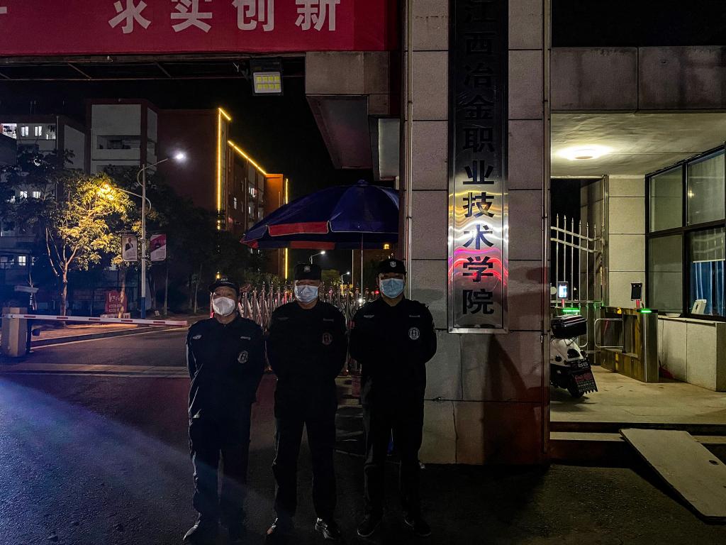 守护——图片故事:此时的冶院已是万籁俱寂,但学校的安保人员彻夜未眠,他们高度戒备,不敢丝毫懈怠,严防死守校园安全的第一道关。