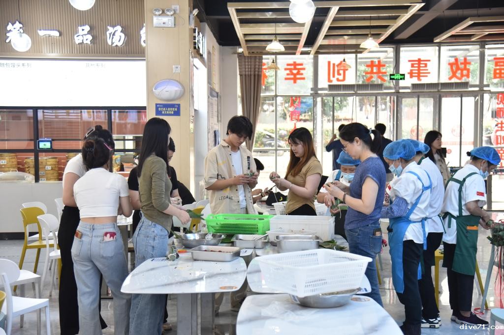 在知行餐厅食堂一楼,大家齐聚一堂。食堂阿姨早早准备好了包粽子所需的糯米、粽叶、线、红枣、鲜肉等材料。有经验的阿姨耐心地传授包粽子的技巧,老师和学生们拿起粽叶,学做漏斗,装糯米,加馅料。大家一边包裹,一边交流怎样包出自己满意的粽子。现场粽叶飘香,气氛融洽,欢声笑语不断。