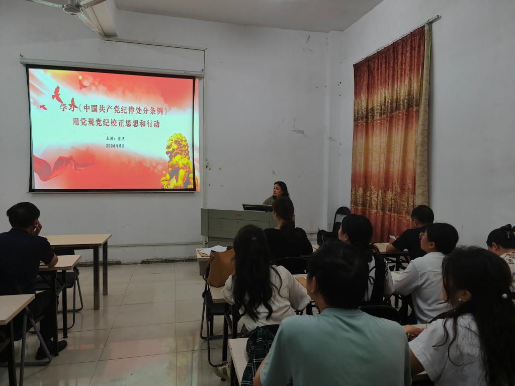 2024年5月21日下午,机关二支部书记董洁为支部全体党员上党课。党课题为“学习《中国共产党纪律处分条例》,用党规党纪校正思想和行动”。党课主要从四个方面来讲述,分别是:《中国共产党纪律处分条例》的修订背景和主要过程;修订《条例》重要意义;新修订的《条例》的特点和准确把握《条例》修订的主旨要义。