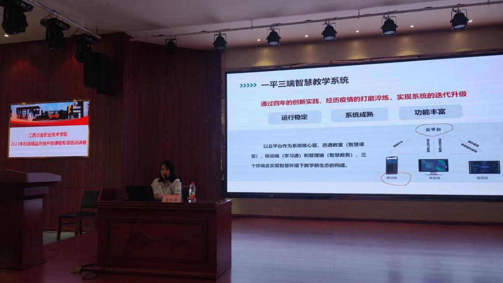 随后,超星江西分公司的谢红芬老师讲授了一平三端助力在线课程建设与运行。谢老师重点向老师们介绍了超星学银在线、泛雅、学习通平台在在线课程建设方面的应用。