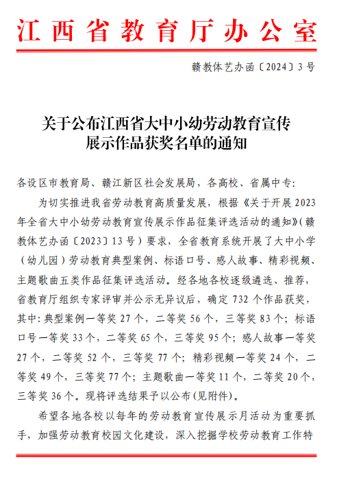 近日,从省教育厅获悉,在2023年江西省大中小幼劳动教育宣传展示作品征集评选活动中,学校共有11个作品获奖,其中:典型案例一等奖1个,二等奖1个,三等奖1个;标语口号一等奖1个,二等奖1个;感人故事一等奖1个,二等奖2个;精彩视频二等奖1个,三等奖2个。