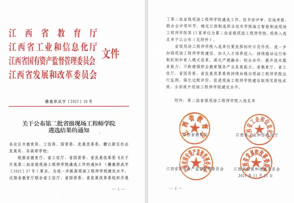 11月22日,从江西省教育厅传来好消息,省厅与工信厅、省国资委、省发改委联合发文,公布了第二批省级现场工程师学院遴选结果,学校锂电智能装备现场工程师学院成功入选。