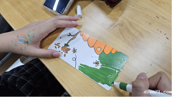 在创作环节,同学们围绕主题,用画笔将节气特色融入书签设计,有人绘就“小满麦渐饱满” 的田园风光,有人描 “霜降木叶丹” 的自然图景,创意迭出,把诗词中的意境化为具象。
