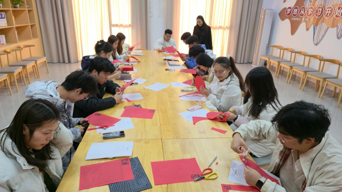 近日,在大学生一站式服务社区知行书苑,图书馆“阅享青春”读书会第六期举行了一次特色剪纸活动,主题为“民族团结石榴红”。20余名学生踊跃参与。