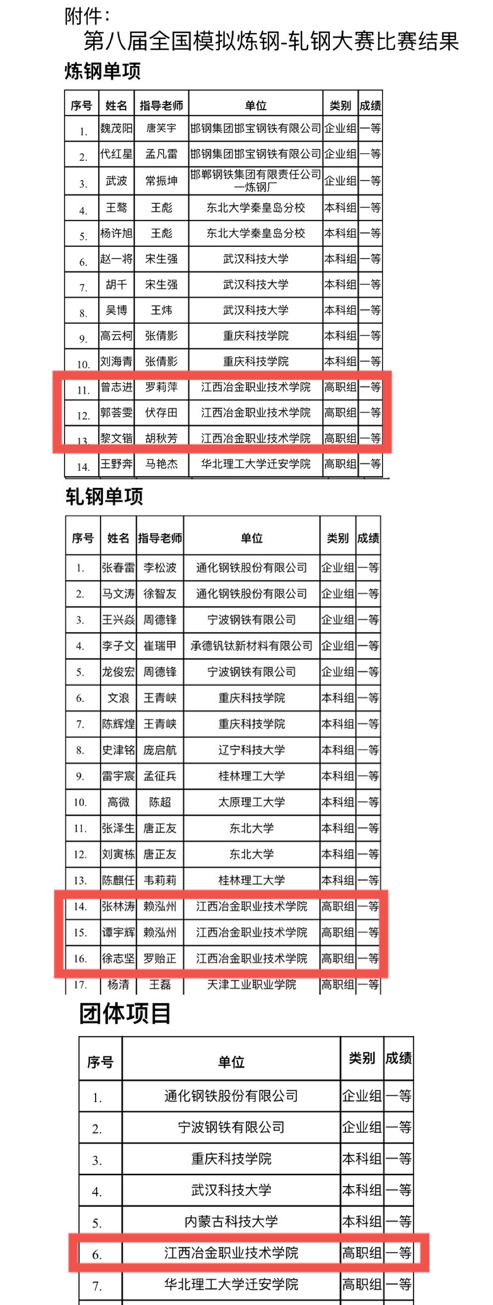 2022年12月,由中国金属学会主办的第八届全国模拟炼钢-轧钢大赛圆满闭幕,学院师生再创辉煌,炼钢单项中由罗莉萍、伏存田、胡秋芳老师指导的学生获3个一等奖,轧钢单项中由赖泓州、罗贻正老师指导的学生获3个一等奖,他们代表taptap扫二维码斩获团体一等奖,这是高职组参赛单位中获得一等奖最多的队伍!