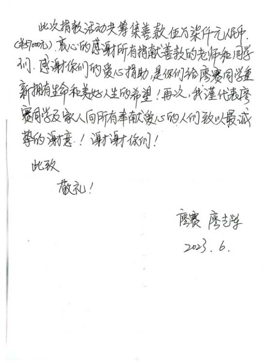 学院对师生们的爱心捐款进行清点、核对、统计后,院领导把这笔爱心款交到廖赛同学的家长手里。接过善款,廖赛家长表示,非常感谢冶金工程学院的师生们的帮助和关心,这些善款不仅是经济上的支持,更是精神上的鼓励和支持,让他们感受到了学校的温暖和关爱。正在治疗中的廖赛还和父亲一起向分院写来了感谢信。据廖赛的爷爷透露,孩子的病情正在逐渐好转。他们会继续努力治疗,希望尽快康复,回到学校继续学业。