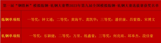 12月22日上午,冶金工程学院第一届“钢铁杯”模拟炼钢-轧钢大赛暨2023年第九届全国模拟炼钢-轧钢大赛选拔赛在线上顺利举办。本次比赛使用全国大赛组委会提供的线上练习及考核系统,共有30余名来自冶金工程学院学子报名参赛。通过激烈角逐,众多选手取得佳绩。以下为获奖名单: