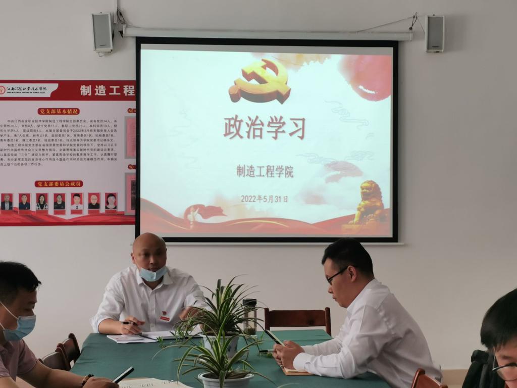 【制造工程学院邹小龙报道】5月31日,制造工程学院在新二教党员活动室召开了政治学习,会议由党支部副书记邓纪纲主持,分院全体教师参加。