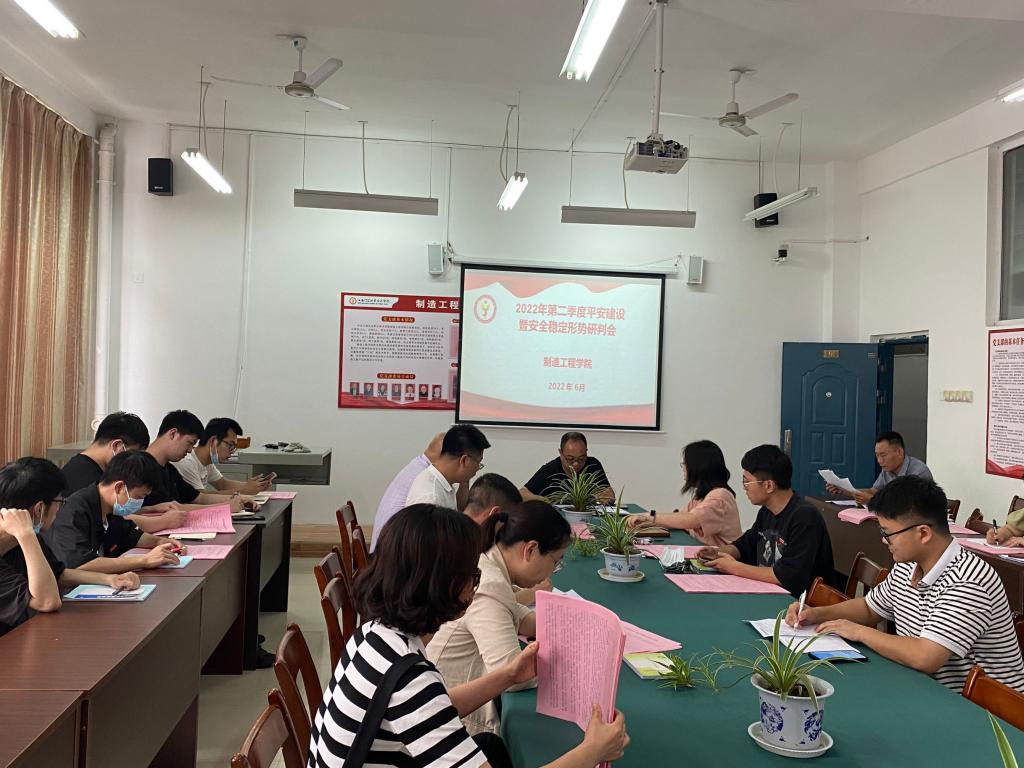 【制造工程学院施斌新报道】 6月13日,在新2教学楼党员活动室,制造工程学院召开了2022年第二季度平安建设暨安全稳定形势研判会。会议由分院党支部副书记邓纪纲主持,全体辅导员、班主任参加了会议。