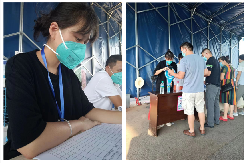 钟雅雯同学表示,这是她第一次穿上“大白”,既紧张又兴奋,因为穿上这套衣服就意味着穿上了责任,既要对他人负责,也要对自己负责。穿上这套衣服之后的第一个明显的感受就是汗如雨下,但在开始工作后就似乎忘却了这感觉,一心只想配合好医护人员的工作。她和另外一位志愿者负责在现场扫码录信息,必要的时候还要教他们如何操作,如果有人没有手机,那么就要询问记录他们的名字、电话号码、身份证号。她笑着说:“在这整个过程中我是享受的,尽管第一次穿上这么正式的防护服有些不适,但也算是体会了一次长期在一线工作的医护人员的艰辛,所以我打心底敬佩那些敢于为国家、为人民做贡献的人们,我要向他们学习。”