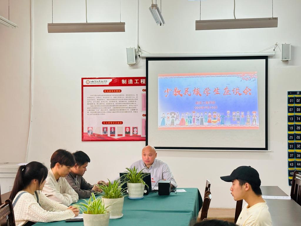 2024年4月26日,制造工程学院在新二教104室召开少数民族学生座谈会,了解少数民族学生思想、学习、生活情况,帮助他们更好融入校园生活,从而进一步铸牢中华民族共同体意识。分院党支部书记邓纪纲出席并讲话,分院全体少数民族学生参会,会议由分院团总支书记杨美主持。