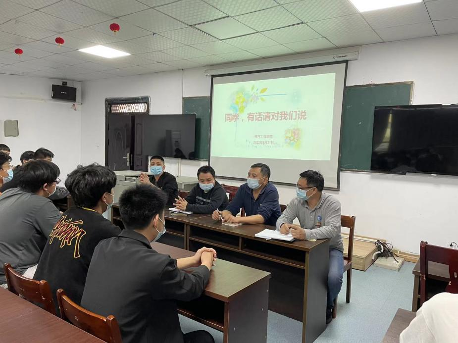 为进一步做好疫情期间封闭式管理下学生思想政治教育工作,倾听学生心声,梳理问题,调节情绪,4月21日、22日下午,电气工程学院分别在明辨楼312召开了“同学,有话请对我们说”主题座谈会。学院院长郭志江和分院领导一起,与学生代表进行了面对面交流互动。