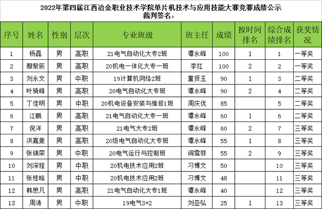 经过赛前防疫检测、赛中模拟仿真设计、赛后评委评分等竞赛环节,最终来自2021级电气自动化大专2班的杨磊同学、2020级机电一体化大专1班的鄢紫辰同学荣获一等奖,来自2019级计算机网络2班的刘永文同学、2020级电气自动化大专班的叶骑峰同学、2020级机电设备安装与维修1班的丁佳明同学、2021级电气自动化大专1班江鹏同学荣获二等奖。