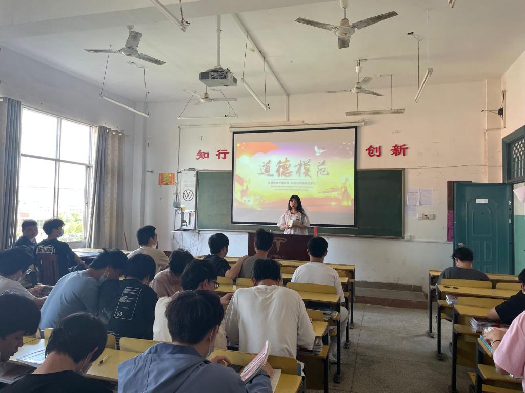 在主题班会中,辅导员和班主任给大家讲述了22名第八届全国道德模范及提名获得者、第七届江西省道德模范先进事迹。有天降神兵,勇救落水四人的王亮;有一生只为一事来,把自己最美好的青春年华无私奉献给了大山里的孩子们的支月英;有全国残疾人创业的领头雁、身残志坚的廖竹生;有不顾个人安危,三闯火海勇救人却不幸落下残疾的周发春。一个个看似平凡的平凡故事,却闪烁着耀眼的人格光芒,道德模范的奉献故事令在场的同学由衷钦佩。