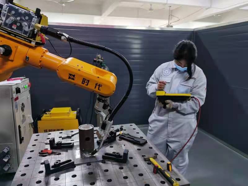 目前,邓甜正在山东省时代焊机厂进行集训和技术交流。她的技术稳中有进,尤其在机器人焊接斜 45°异径管三通上有新突破。焊接是一门技术活,要在原有的基础上提高一分,都要付出比原先10倍的汗水。经过半个多月的交流、培训,她的技术总体上前进了一步。小邓有信心,指导老师也有信心,在国赛上再创辉煌。