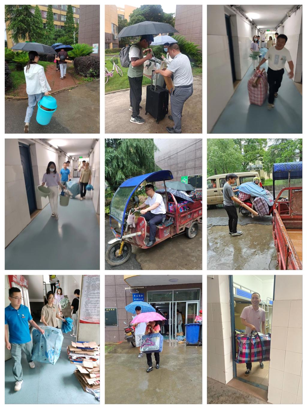 在活动过程中,党员教师们尽心尽力的帮学生整理生活用品,冒着小雨穿梭在宿舍楼和教学楼之间,来来回回把学生的行李贴心地搬进教学楼,不停地提醒学生,要擦干行李袋上少量的雨水,以免受潮发霉,全程井然有序。