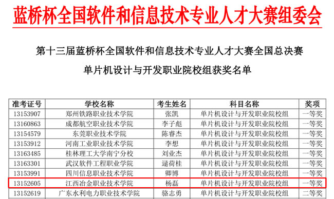 2022年6月27日,从蓝桥杯大赛组委会官网获悉,学院杨磊同学荣获2022年第十三届蓝桥杯全国总决赛单片机设计与开发职业院校组一等奖。这是江西省在单片机设计与开发职业院校组唯一的国赛一等奖。鄢紫辰、刘永文同学荣获二等奖,洪嘉豪荣获全国总决赛EDA设计与开发大学组二等奖,竞赛成绩相比往年有较大突破,同时学院被评为优秀组织单位。