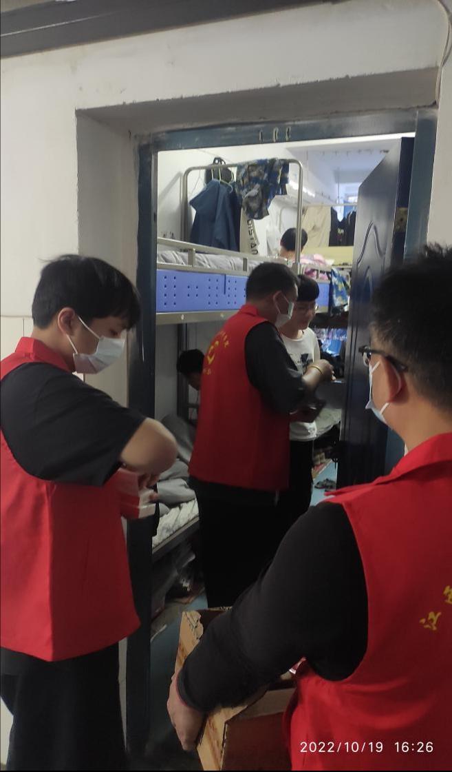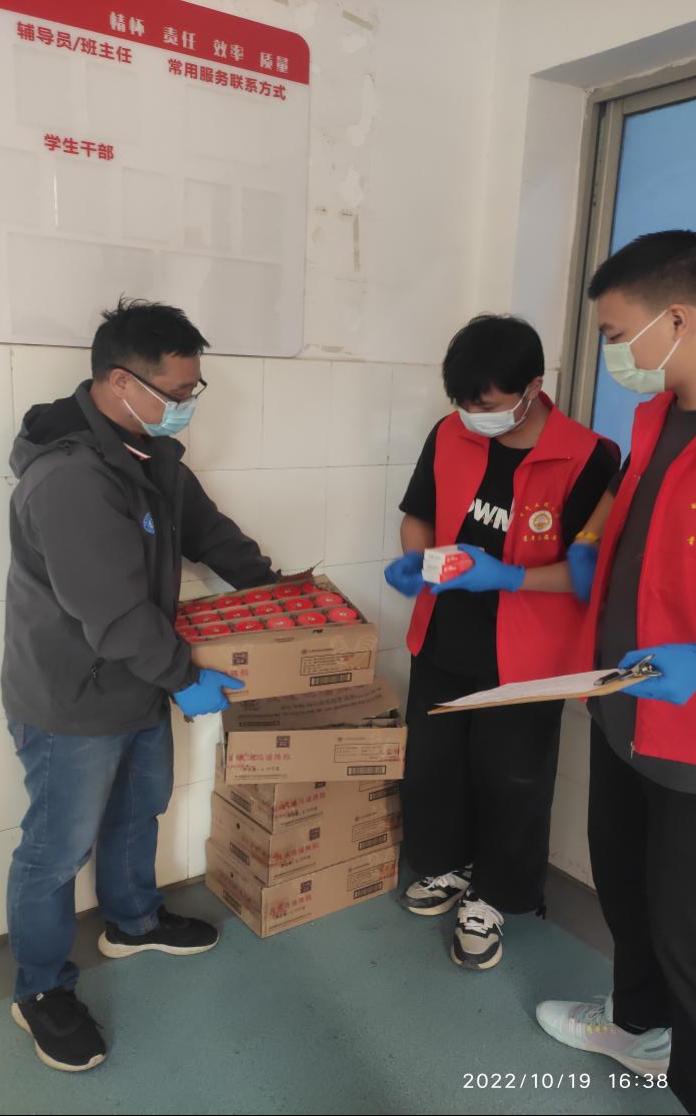 疫情无情,人有情。10月19日,1栋宿舍楼负责人黄辉代表学校,带领老师和志愿者在1栋寝室给学生“加餐”。