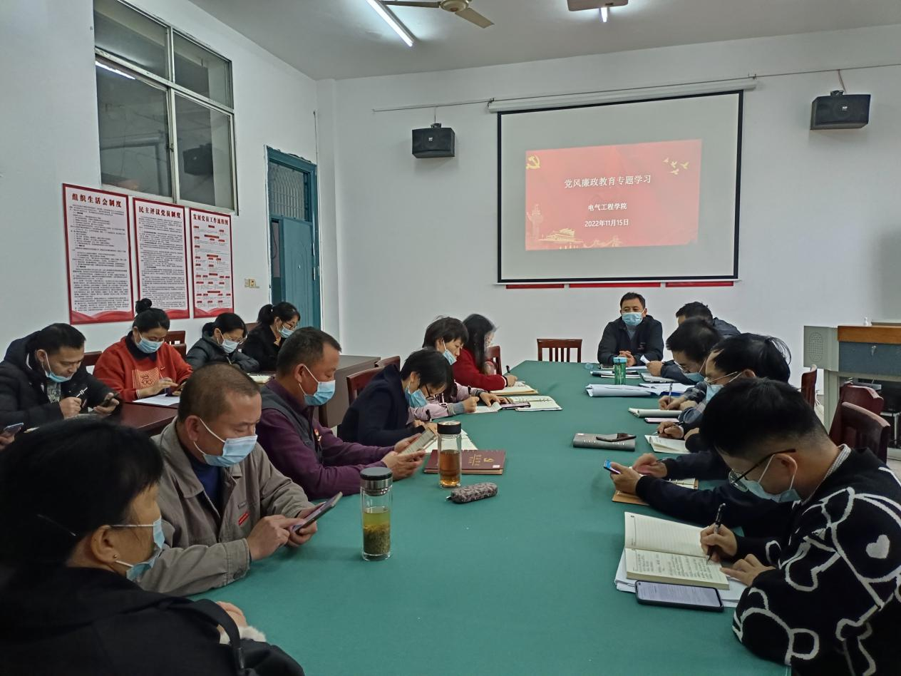 11月15日下午,在明辨楼102,电气工程学院组织分院全体教师开展了2022年下半年党风廉政建设专题学习。会议由党支部书记刘绍彬主持。