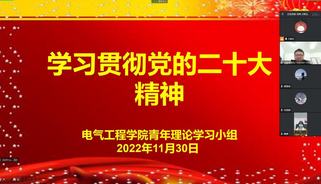 11月30日,电气工程学院青年教师理论学习小组开展本月的政治理论学习,以腾讯会议的形式线上学习了党的二十大精神。本次学习由组长李红主持,党支部书记刘绍彬和全体青年教师参加。