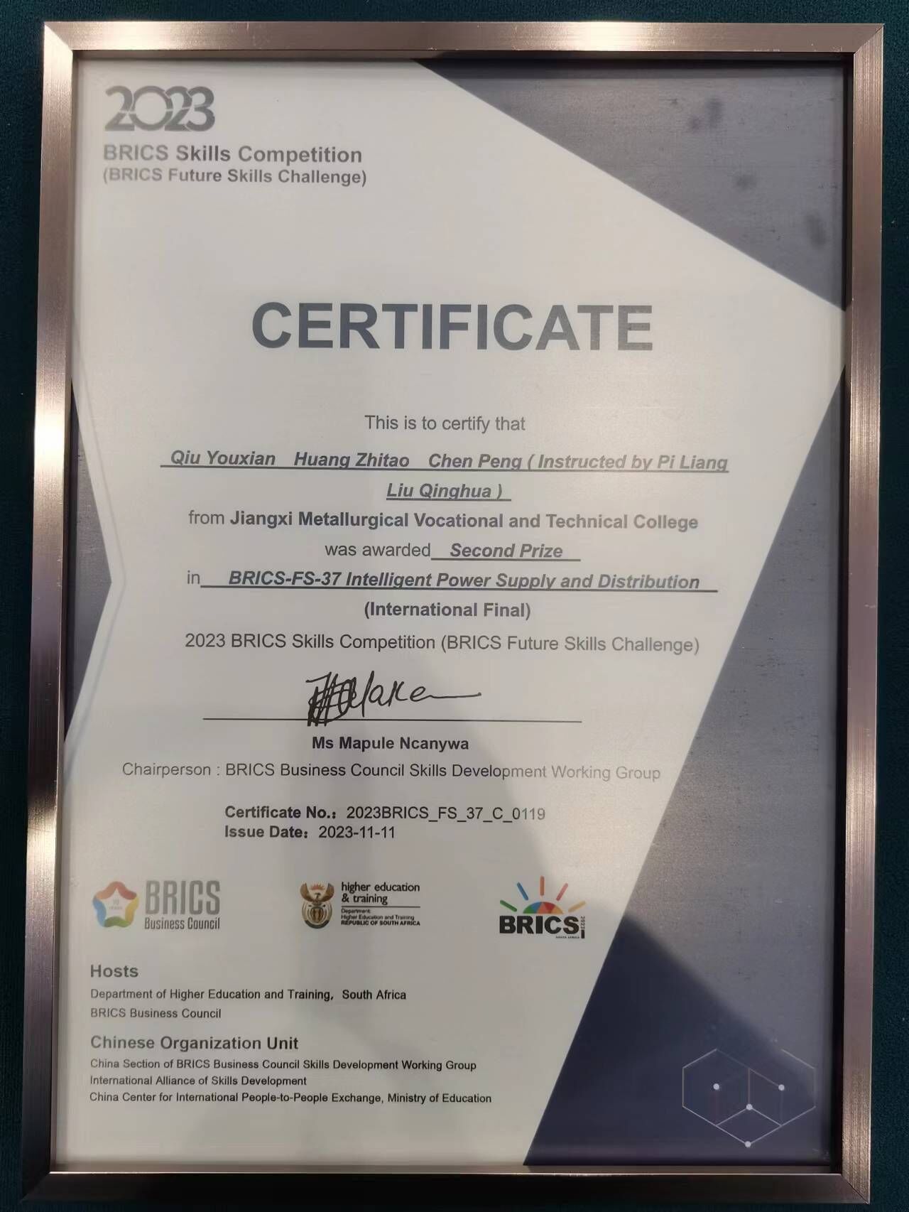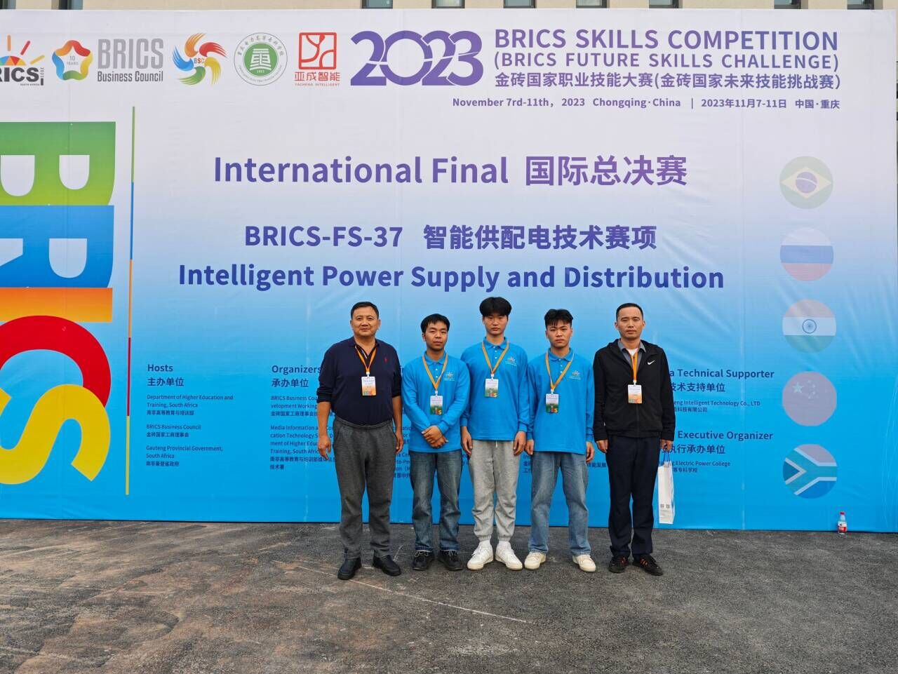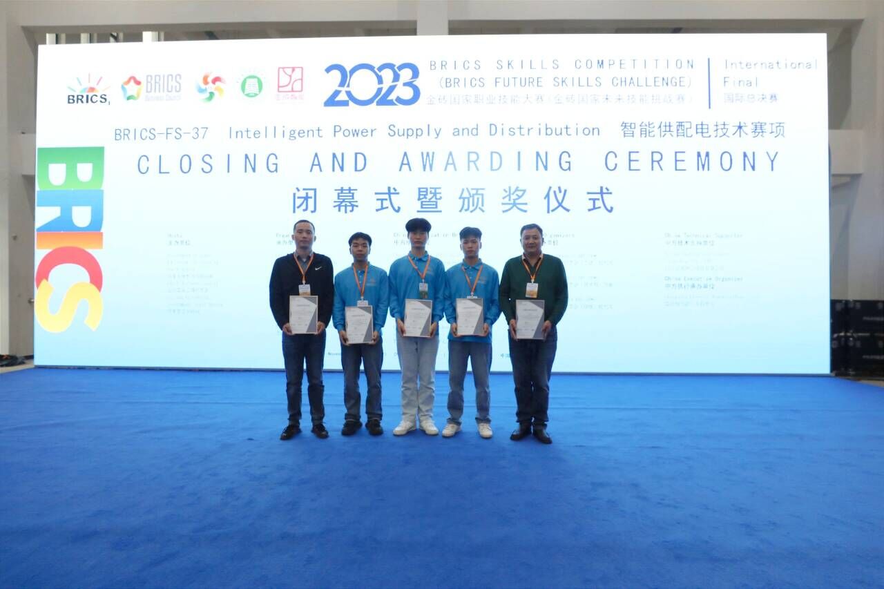11月11日,2023年金砖国家职业技术大赛(金砖国家未来技能挑战赛)国际总决赛BRICS-FS-37智能供配电技术赛项在重庆电力高等专科学校圆满落下帷幕。经过二天的激烈角逐,电气工程学院陈鹏、邱幼贤、黄志涛3名同学在皮梁、柳清华两位老师指导下荣获二等奖。