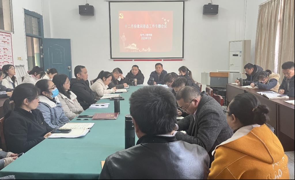 2023年12月5日下午,电气工程学院于明辨楼102召开了十二月份意识形态工作专题会议。会议由电气工程学院党支部书记刘绍彬主持,电气工程学院支委成员、干事、辅导员及教研室主任参加会议。