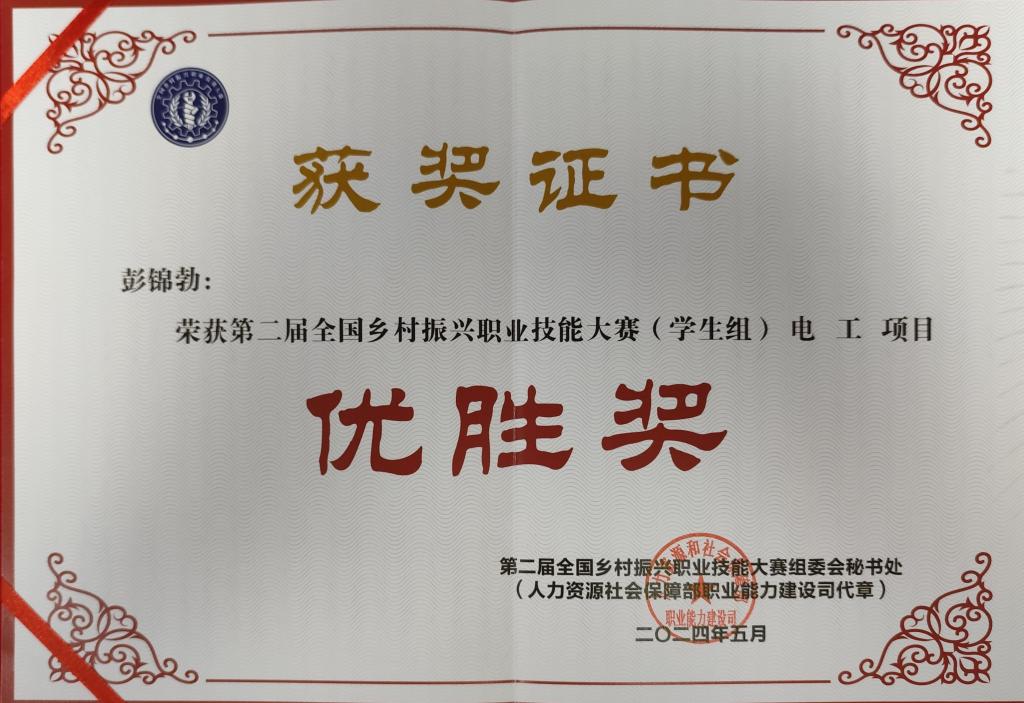 彭锦勃同学在省赛电工(学生组)项目中取得第一名,荣获“金牌”,在国赛电工(学生组)项目中获“优胜奖”。