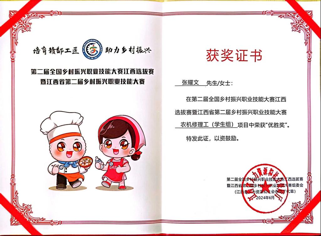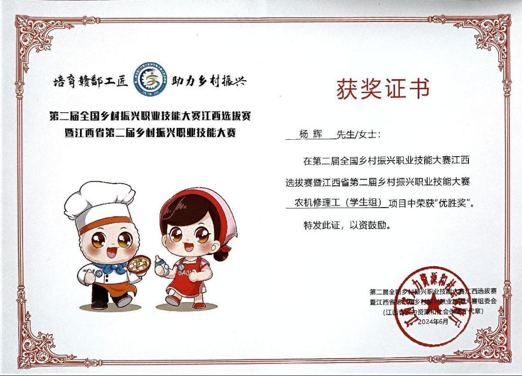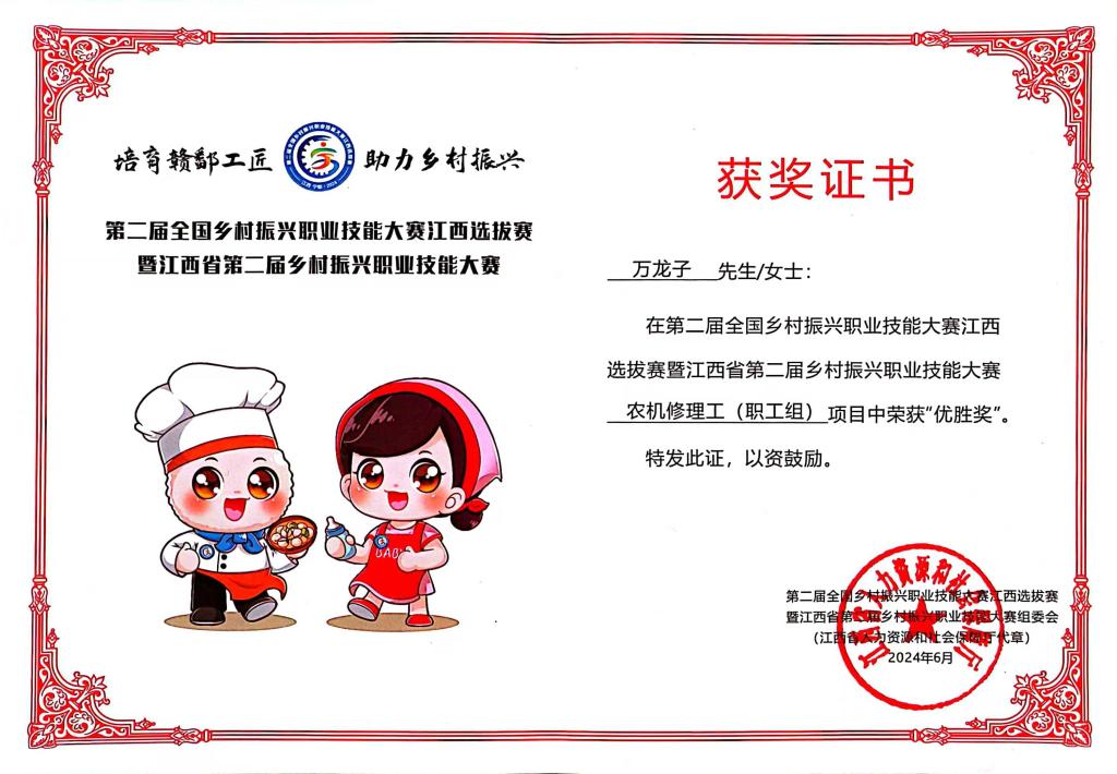 万龙子老师在省赛农机修理工(职工组)项目中取得第四名,获得优胜奖,并被授予“江西省技术能手”称号。