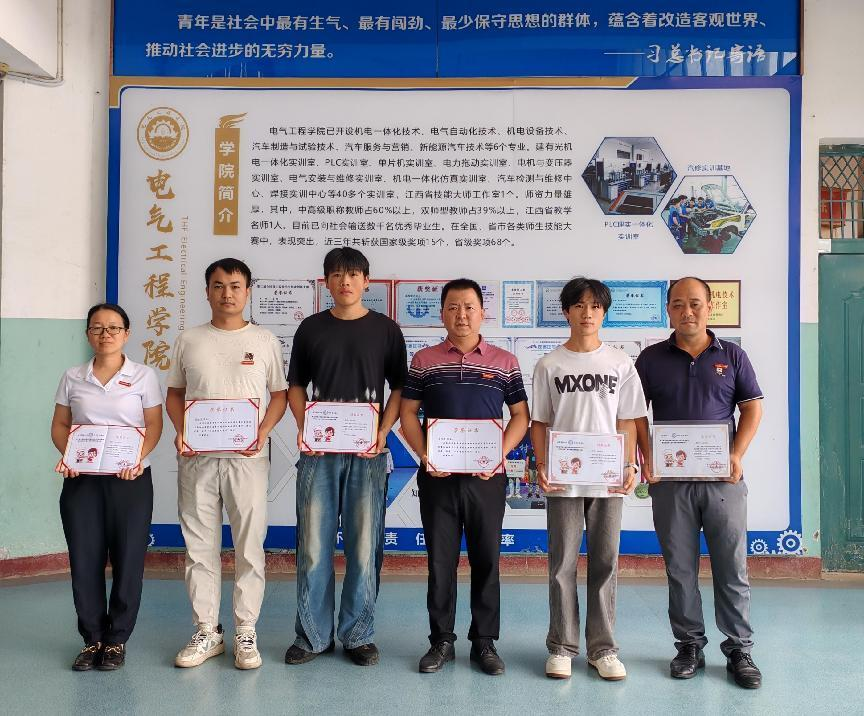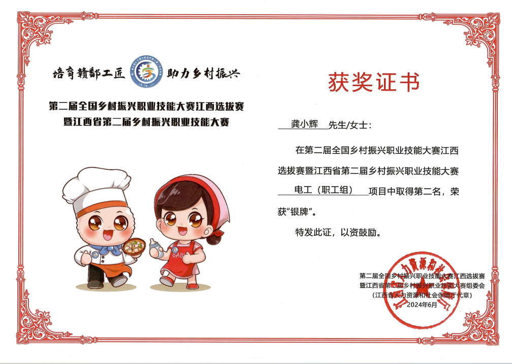 龚小辉老师在省赛电工(职工组)项目中取得第二名,荣获“银牌”,并被授予“江西省青年岗位标兵”和“江西省技术能手”称号。