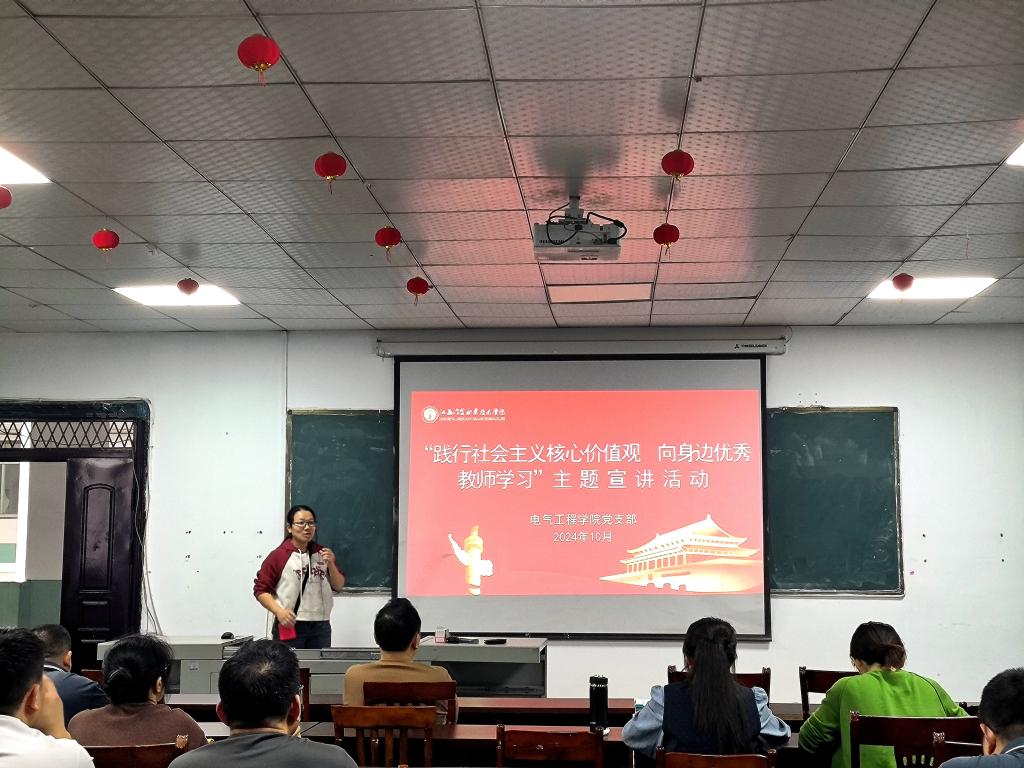 2024年10月15日,电气工程学院党支部组织开展了“践行社会主义核心价值观,向身边优秀教师学习”主题宣讲活动。活动中,优秀教师柳清华为分院教师带来了一堂生动精彩的宣讲。