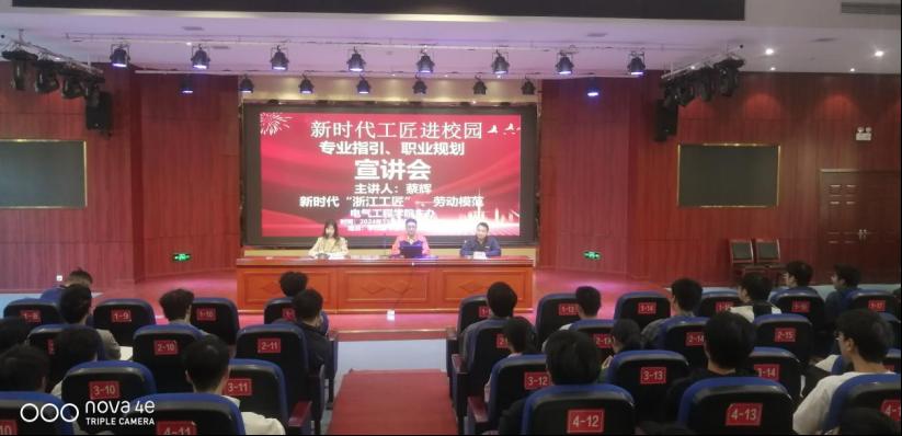 2024年11月8日,电气工程学院举办新时代工匠进校园讲座,特邀新时代“浙江工匠” 、宁波市劳动模范、吉利汽车集团技能大师蔡辉面向分院青年学生宣讲交流。分院院长黄锦文、副院长黄辉和300多名学生代表参加,刘依纯老师主持。