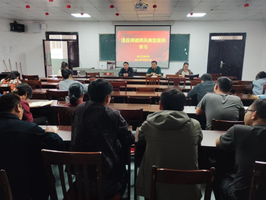 11月12日,电气工程学院在明辨楼312开展第四期违反师德师风典型案例汇编专题学习。会议由分院党支部书记刘绍彬主持,分院院长黄锦文出席,全体教职工参加。