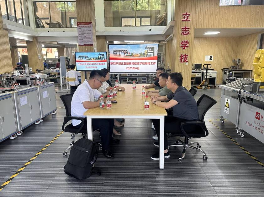 为深化产教融合校企合作,2025年6月6日上午,比亚迪集团人力资源处招聘经理郑维贤、比亚迪集团人力资源处招聘主管吴春桢、张慧康一行来我院调研交流。电气工程学院院长黄锦文,电气工程学院副院长黄辉、罗卫华,汽车专业教师参加座谈会,会议由黄辉主持。
