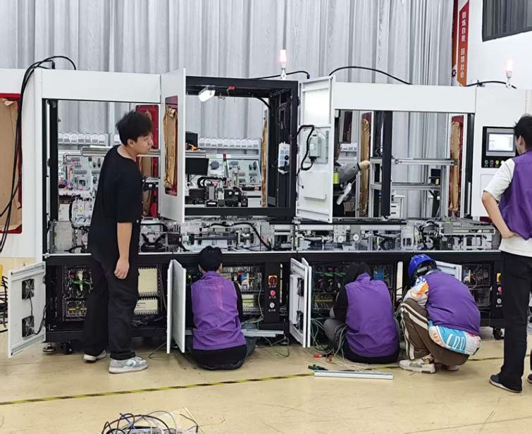 面对时间紧、任务重的挑战,全体师生迎难而上,迅速投入紧张的项目攻坚工作中。项目执行过程中,师生团队分工明确、协同作战,有条不紊推进三大核心任务:一是基础组装,完成800余件标准件精准匹配与组装,搭建起上载具人工焊接、焊接人工检测、焊接检测及点胶、UV固化、固化后CCD检测、人工取料及上铝巴—载具回流6个核心功能机构,保障各部件衔接精度完全符合设备运行标准;二是线路与气路施工,扎实开展动力线路、控制线路的接线端子压接与线路规整工作,同步推进气路布管与规整作业,确保电路导通顺畅、气路密封无泄漏;三是整体调试,完成设备空载试运行、负载测试、精度校准等全流程调试,逐一攻克机构卡顿、信号传输异常等技术难题,最终实现设备各项指标均达到企业验收标准。