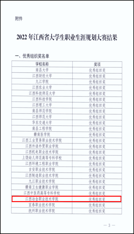 12月15日,2022年江西省大学生职业生涯规划大赛顺利闭幕。智能工程学院的参赛项目《啊呀嘞,了不得的乡村振兴信息员嘞》在此次大赛中荣获银奖,学校荣获最佳组织奖,张春芽、黄露、聂丹三位老师荣获优秀指导老师,取得了学校本赛项零的突破。