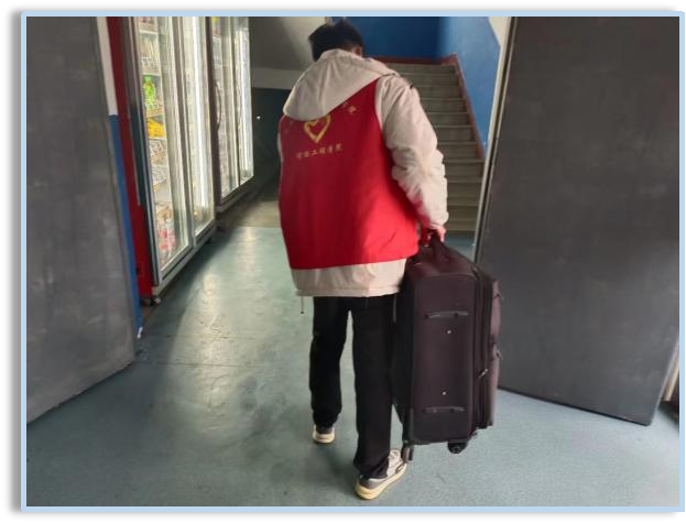 天下起了雨,给志愿者们带来不小的考验。他们不惧困难,坚持为同学们服务,冒着雨奔向宿舍。
