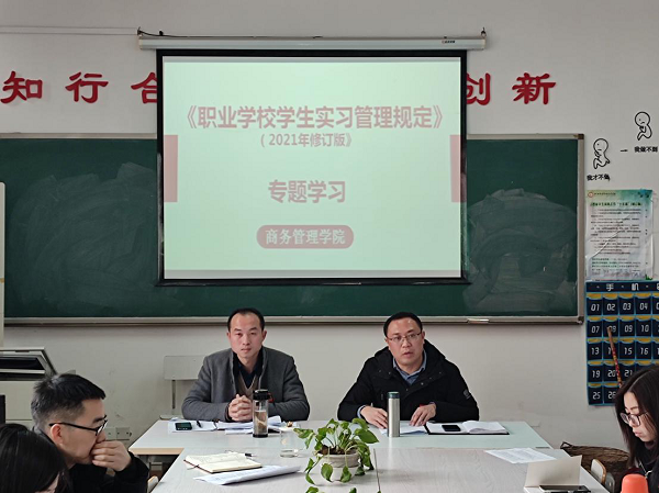 2月19日下午,商务管理学院组织辅导员及教师在党员活动室集中学习了教育部等八部委印发的《职业学校学生实习管理规定》(21版),会议由分院副院长郭斌主持,党支部副书记唐毓林及院长助理陈利华出席会议。