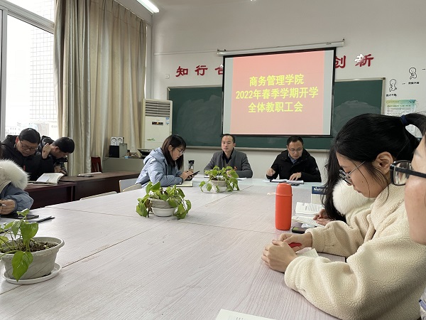 凯歌辞旧岁,瑞虎迎新春。2022年2月20日上午,商务管理学院在新三教208党员活动室召开了2022年春季学期全体教职工大会,分院副院长郭斌主持会议,副书记唐毓林、院长助理陈利华以及全体教职工参加。